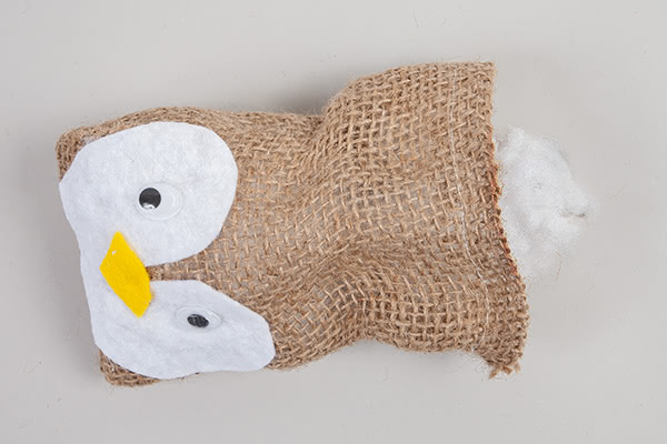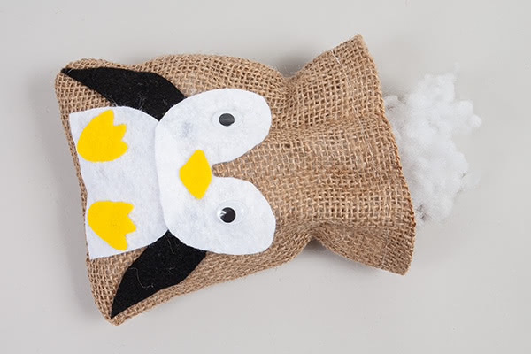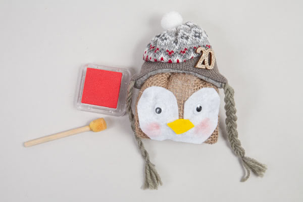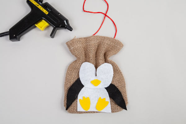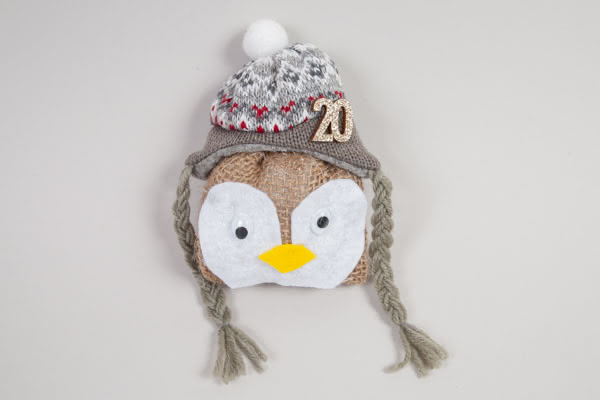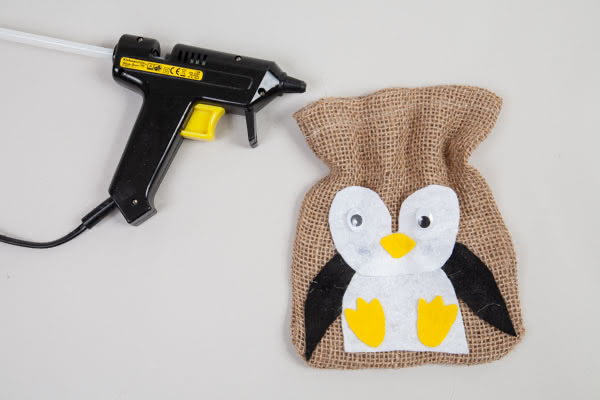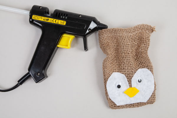 Bindet das Jutesäckchen wieder zusammen, setzt dem Pinguin eine Mütze auf und befestigt sie mit ein paar kleinen Heißklebepunkten.