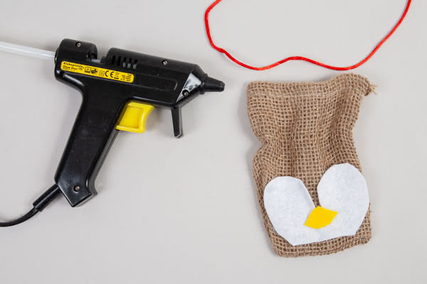 Öffnet das rote Band des Säckchens und klebt Kopf und Nase auf das Jutesäckchen.