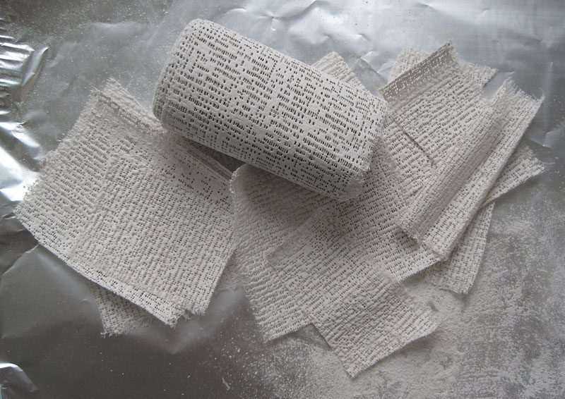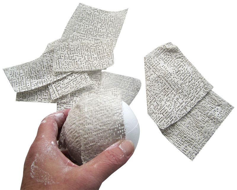 Als Erstes schneidet Ihr von der Gipsbinde verschieden große Stücke ab.