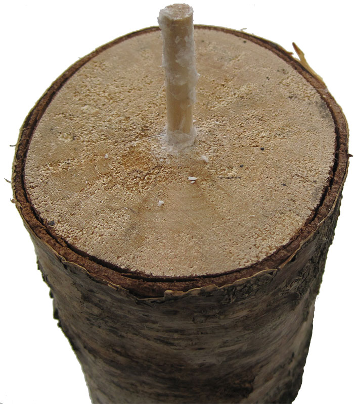 Als Nächstes bohrt von oben ein Loch in den Baumstamm (ca. 40 cm lang und 10 cm Ø) und klebt einen Holzstab (5-8 mm stark) hinein. Diesen benötigen wir zur Befestigung des Kopfes.