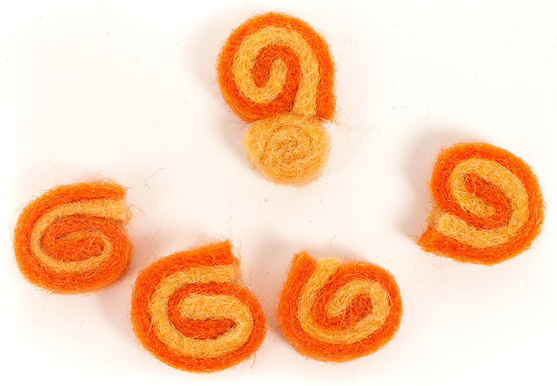Jetzt rollt Ihr kleine Schnecken auf. Wenn Ihr den gewünschten Durchmesser erreicht habt (bei unserer kleinen, orangenen Blüte haben die Blütenblätter ca. 2 cm Ø), schneidet Ihr die Filzstreifen ab und befestigt die Enden mit ein wenig Heißkleber.