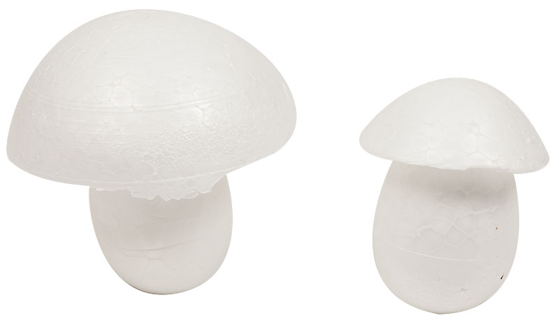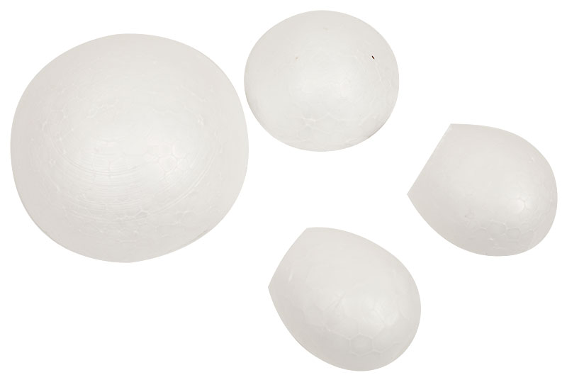 Als Erstes schneidet Ihr für den Hut des Pilzes von der Styropor-Kugel mit einem Messer ein Stück ab. Damit der Gipspilz später gut steht, braucht er eine Standfläche: Deshalb schneidet Ihr vom Styropor-Ei (der spätere Pilzfuß) auch eine Kappe ab. Und natürlich muss auch am Fuß des Pilzes oben die Kappe abgeschnitten werden als Auflagefläche für die Kappe.