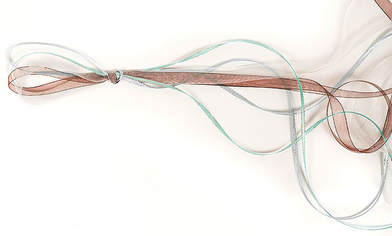 Vom Chiffonband braun und weiß und dem schmalen Satinband weiß-silber und mint jeweils 1,75 m abschneiden und am oberen Ende mit allen vier Bändern gleichzeitig eine Schlaufe knoten, die später als Aufhängung dienen wird.
