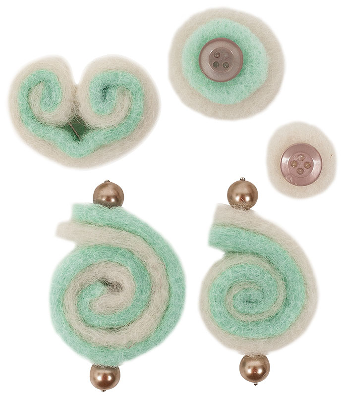Jetzt sind die kleinen Ornamente aus Filz dran: Die Filzstreifen dazu übereinander legen und zu kleinen Schnecken aufdrehen. Anschließend schiebt Ihr eine Perle auf die Stecknadel und fixiert die Schnecken mit den Stecknadeln. Die beiden Seiten vom Herz klebt Ihr mit wenig Heißkleber zusammen. Für den Kreis schneidet Ihr ein Stück Filz mit einem Durchmesser von ca. 2 cm zu, den Knopf ist 1 cm groß – ihn klebt Ihr direkt in die Mitte des Filzkreises.