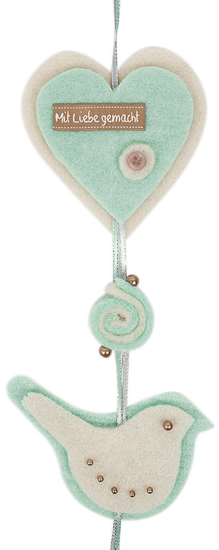 Jetzt klebt Ihr das kleine Herz auf das große Herz. Die zwei Bänder werden gleichzeitig mit angeklebt. Genauso verarbeitet Ihr die beiden Vögel und das zweite Filzherz.