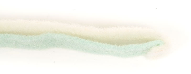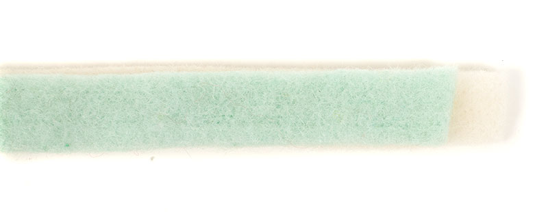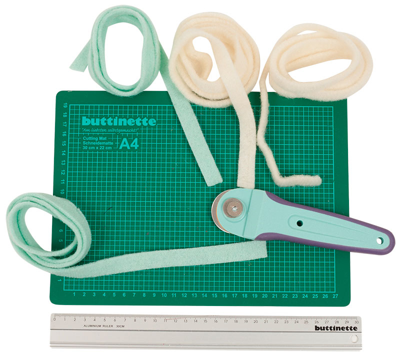 Aus dem Filzband mit dem Rollschneider ca. 1 bis 2 cm breite und ca. 100 cm lange Streifen schneiden. Beim Arbeiten mit einem Rollschneider benötigt Ihr eine Schneidematte und ein Alulineal.