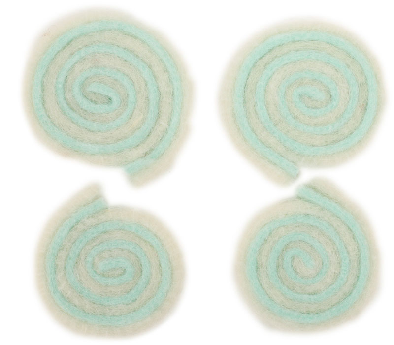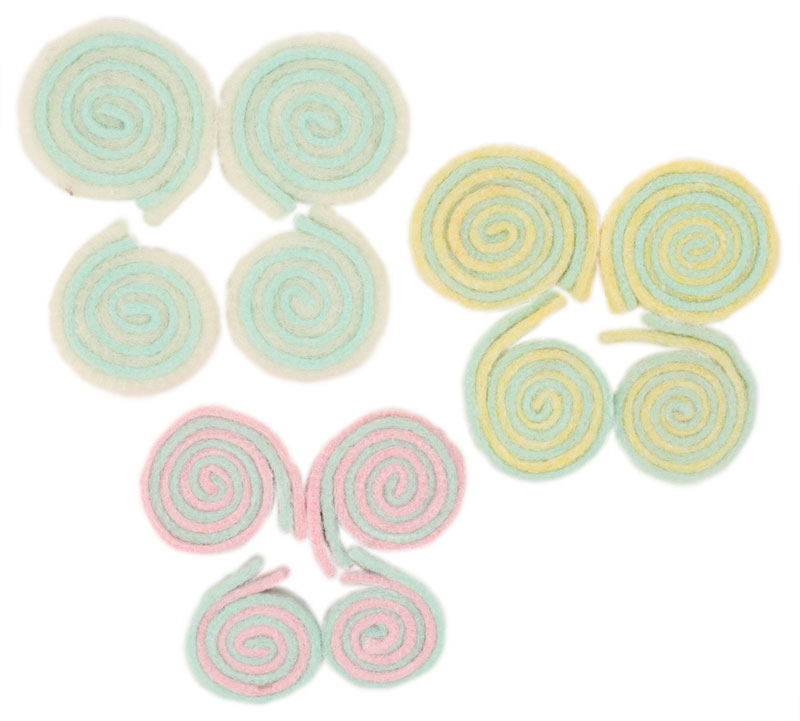 Jetzt rollt Ihr die kleinen Schnecken auf. Zwischendurch immer wieder mal mit wenig Heißkleber fixieren, damit später nichts verrutscht. Wenn der gewünschte Durchmesser erreicht ist, schneidet Ihr die Filzstreifen ab und befestigt die Enden mit wenig Heißkleber.