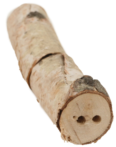 Nachdem die Flügel für unseren Filzschmetterling vorbereitet sind, machen wir uns jetzt daran den Körper zu basteln. Dafür bohrt Ihr in ein Birkenstöckchen von oben mit einem Handbohrer zwei kleine Löcher.