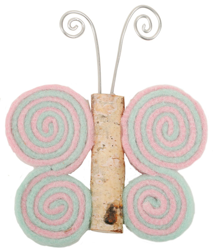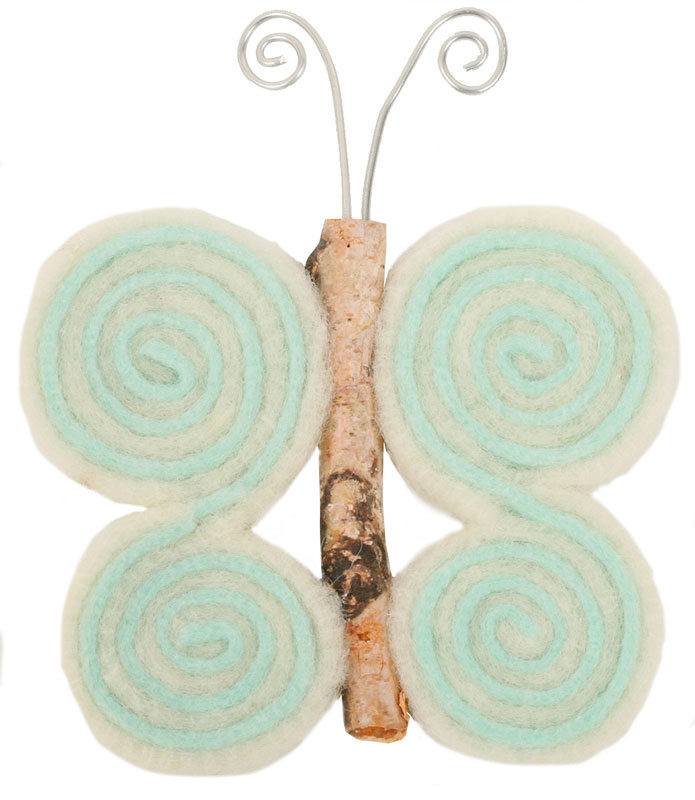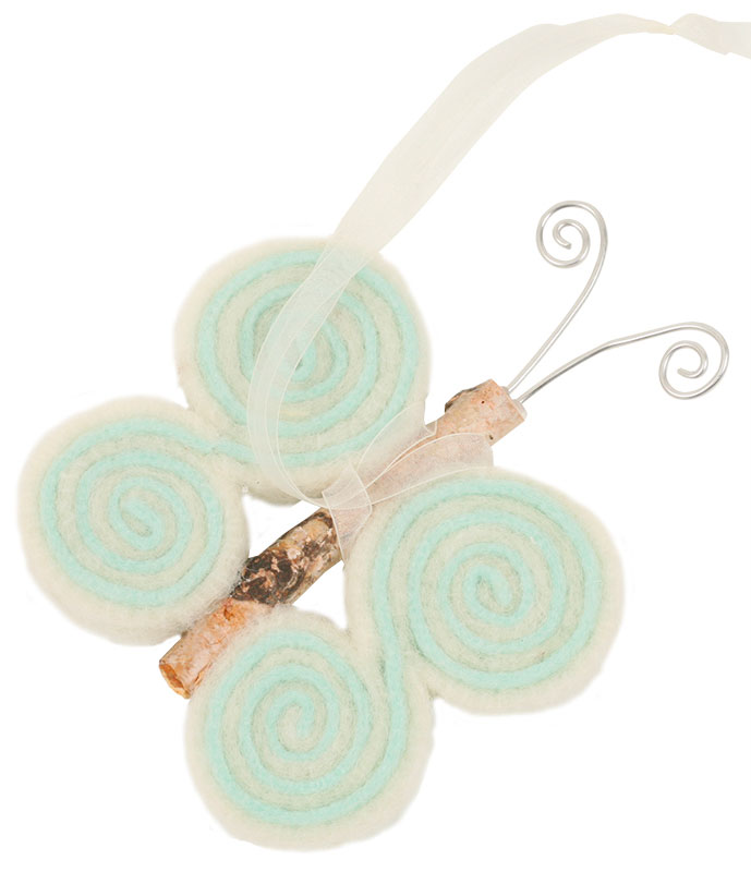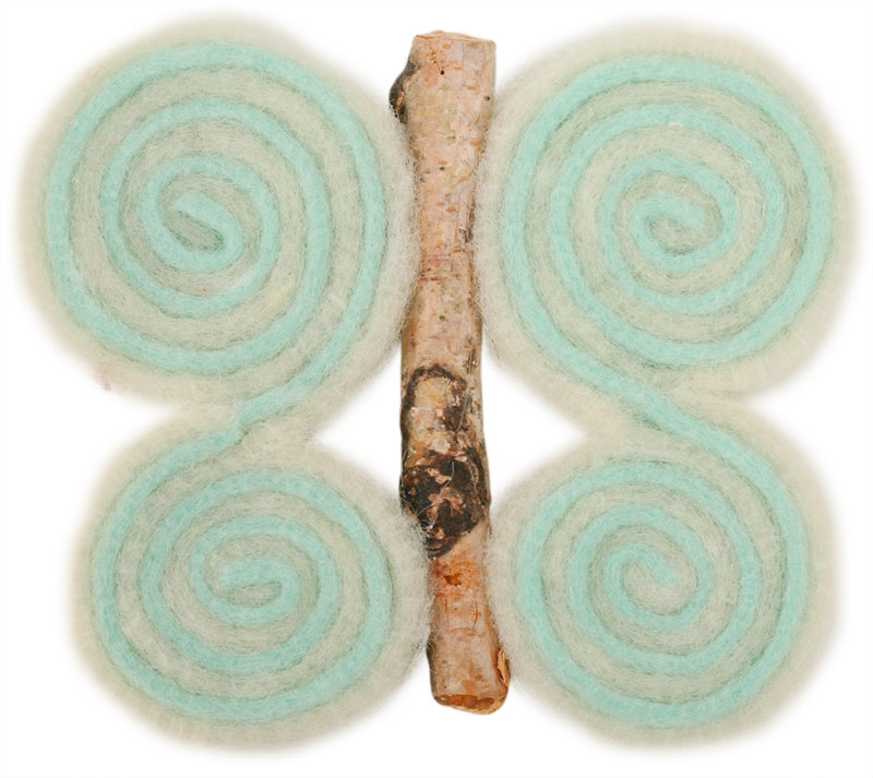 Falls Ihr Eure Filzschmetterlinge aufhängen möchtet, bringt Ihr einfach noch ein Chiffonband an. Das lässt sich ganz einfach zwischen Birkenstöckchen und Flügel durchfädeln.