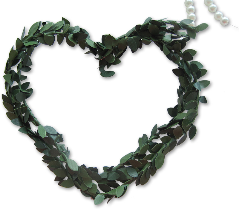 Ist das ganze Herz mit den Perlen umwickelt, so wird am unteren Teil ein Satinband verknotet und zu einer Schleife gebunden.