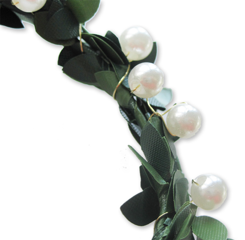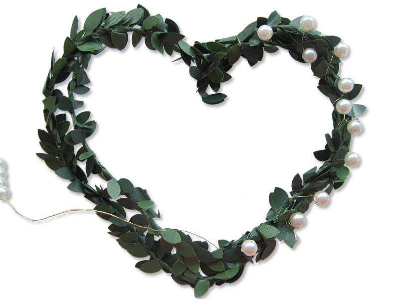 Nun nehmt ein ca. 1 m langes Stück Golddraht und befestigt dieses an der Herz-Girlande. Fädelt anschließend 30 weiße Perlen auf.