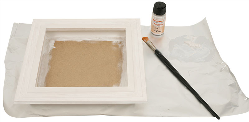 Zuerst bemalt Ihr den 3D-Bilderrahmen mit weißer Acrylfarbe. Für eine schöne glatte Oberfläche schleift Ihr den Rahmen nach dem ersten Farbauftrag mit einem Schleifschwamm ab. Danach gebt Ihr eine zweite Schicht weißer Acrylfarbe auf. Dann ist die Grundierung schön deckend.
