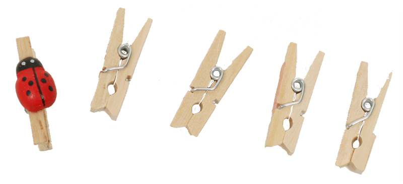 Die Scheine für unser Geldgeschenk werden mit Wäscheklammern an der Kordel befestigt. Dafür löst Ihr zuerst mit einem Messer vorsichtig die Marienkäfer von den kleinen Holzklammern ab.