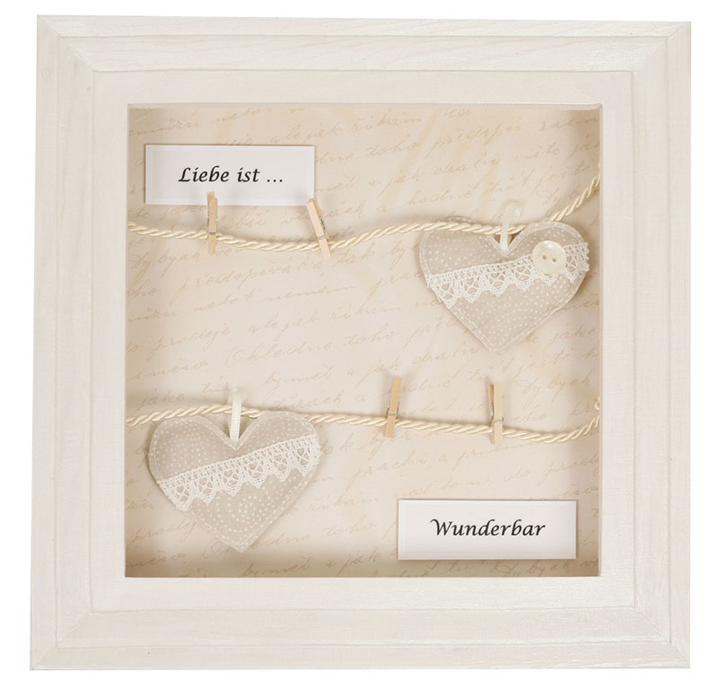 Fädelt auf jeden Kordelstrang ein Herz auf. Jetzt könnt Ihr auch an die zweite Seite der Kordel einen Knoten setzen und ebenfalls mit Heißkleber in den Rahmen kleben.