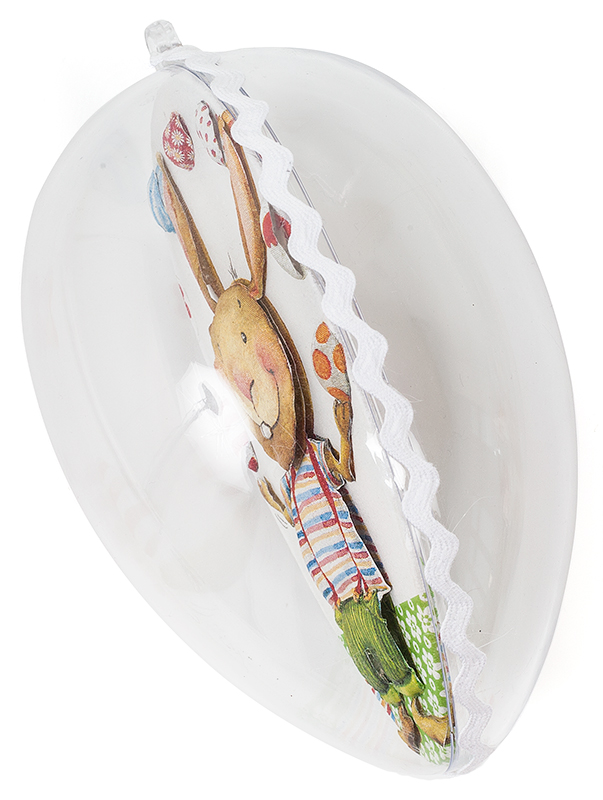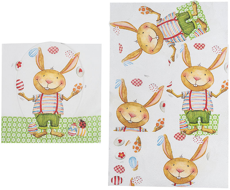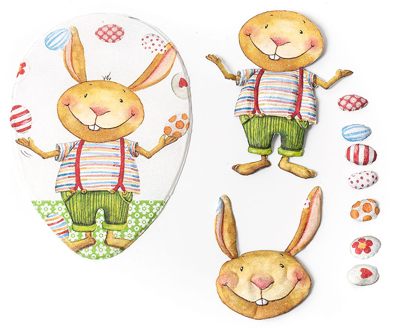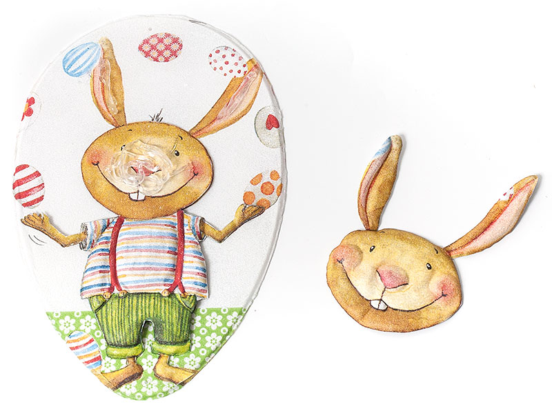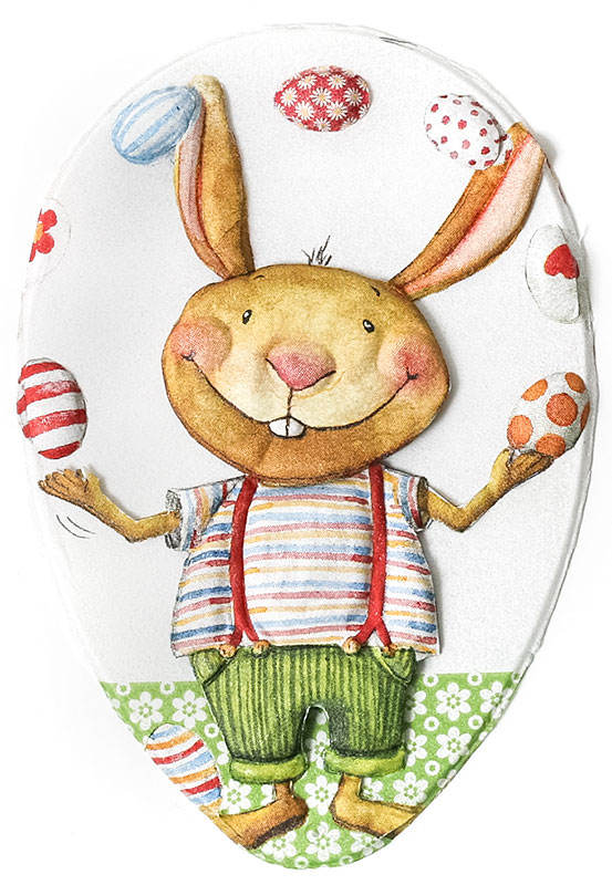 Jetzt fehlen nur noch die Ostereier, die der Hase herumjongliert. Die Eier, die nur teilweise auf das Ei passen, werden vor dem Aufkleben in Form geschnitten.