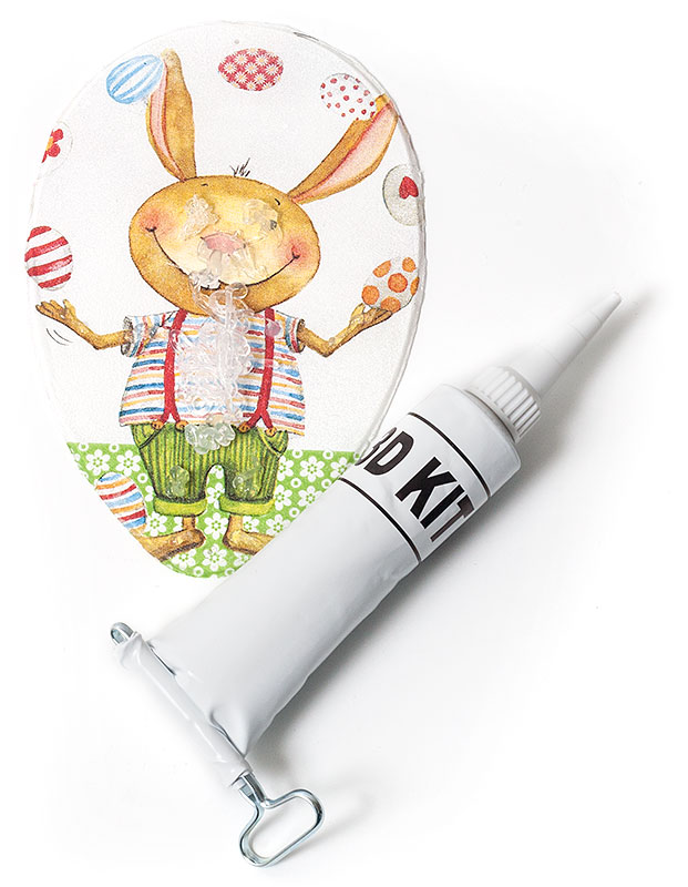 Jetzt geht es ans Aufkleben der Motive. Dafür Silikonkleber auf das Hasenmotiv geben und den Körper aufkleben.