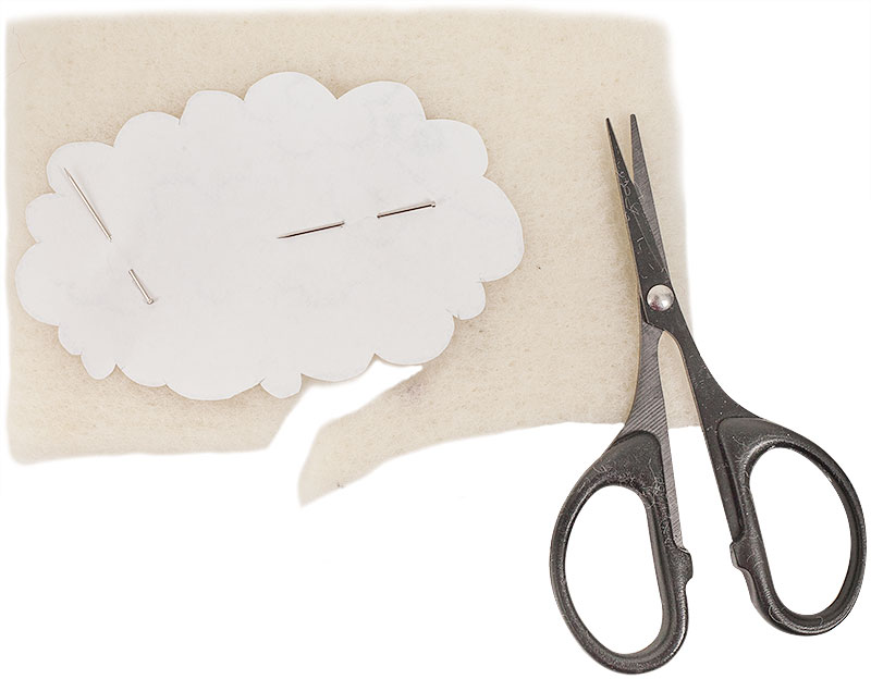 Zuerst druckt Ihr die Vorlagen aus und schneidet sie aus. Die Vorlage fixiert Ihr mit Stecknadeln auf dem Filz fest. Danach schneidet Ihr entlang der Vorlage den Filz aus.