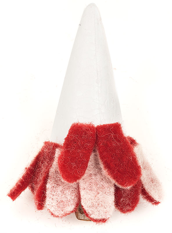 Dieses Quadrat klebt Ihr dann über die Spitze des Styropor-Kegels und zupft es nach unten etwas aus.