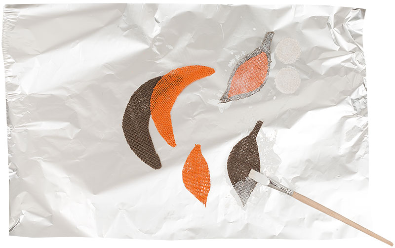 Bestreicht die einzelnen Rupfenteile mit einem Borstenpinsel mit Deko-Form. Gleichzeitig die Teile übereinandersetzen und nach eigenem Ermessen etwas formen.