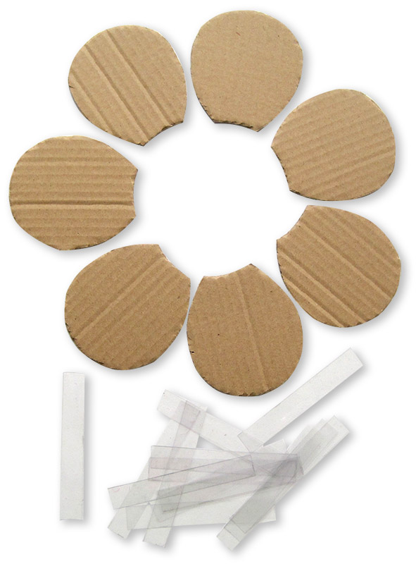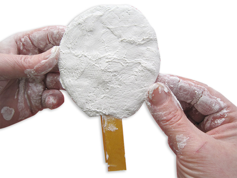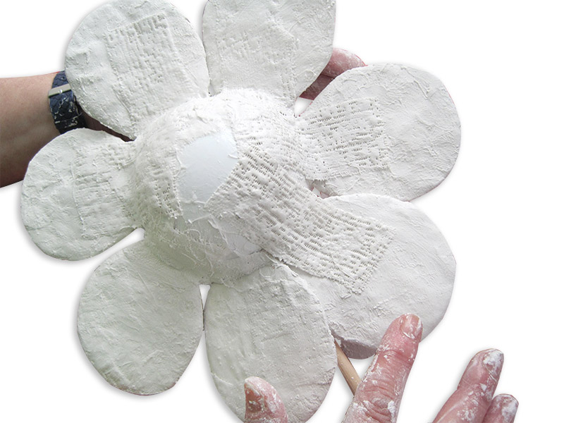 Danach belegt Ihr die sieben Blütenblätter mit der Gipsbinde und befeuchtet sie immer wieder mit etwas Wasser.