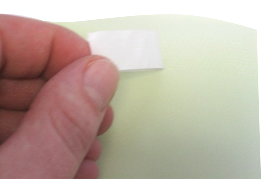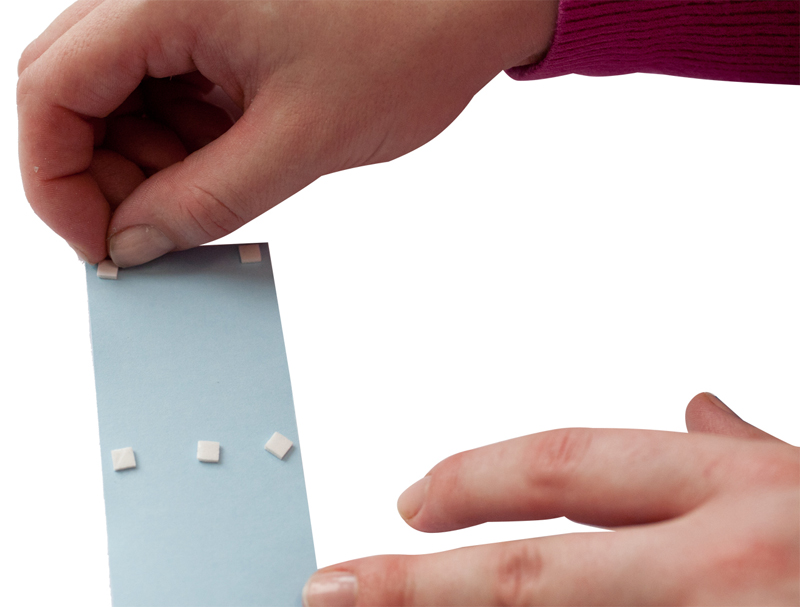 Auf der Rückseite des Rechtecks ein paar Schaumstoffquadrate verteilt aufkleben. Die Folie der Schaumstoffquadrate abziehen.