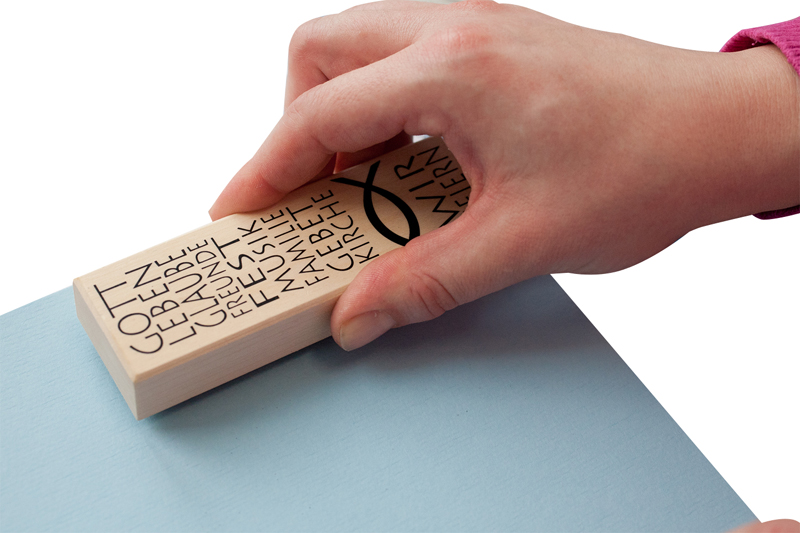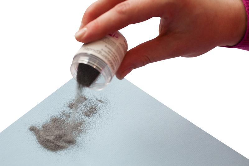 Den Stempel auf das blaue Scrapbooking-Papier stempeln. Anschließend das Embossing-Puder auftragen. Das überschüssige Pulver kann zurück in die Dose gekippt werden. Die Schrift auf dem Papier nun mit einem Heißluftfön zum Schmelzen bringen. Das Rechteck mit der Schrift nun mit ein wenig Randzugabe ausschneiden.