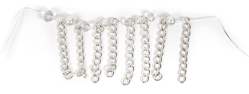 So fädelt Ihr weiter, bis Ihr durch alle Elemente der Gliederkette einen Perlenstrang gefädelt habt. Dazwischen den Perlensträngen lasst Ihr jeweils ein Kettenelement frei.