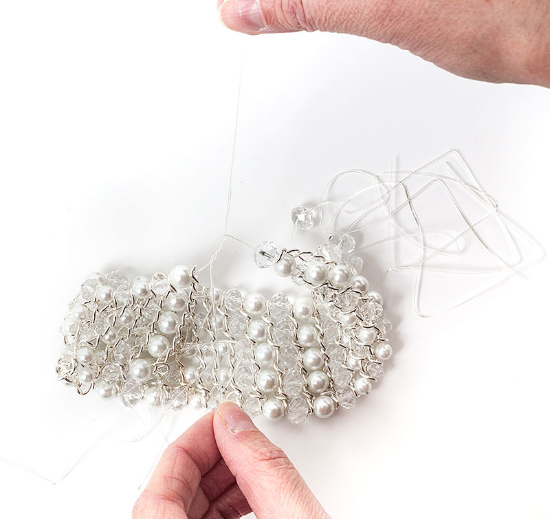 Wenn die erste Reihe gefädelt ist, den nächsten Elastikfaden nehmen und durch das dritte Gliederkettenelement fädeln. Dann eine Perle, das nächste Gliederkettenelement, wieder eine Perle usw…