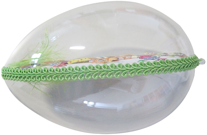Legt die fertige Trennscheibe in das Kunststoff-Ei und verschließt es. Beklebt die “Naht” des Kunststoff-Eis einmal rundherum mit doppelseitigem Klebeband. Bringt auf dem Klebeband dann die hellgrüne Borte an.