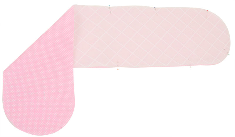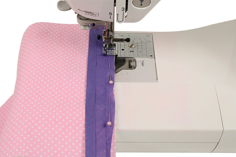 Jetzt wird das Schrägband von der rechten Seite festgesteckt. Achtet darauf, dass die Nadeln auf der linken Seite auch im Schrägband stecken.
