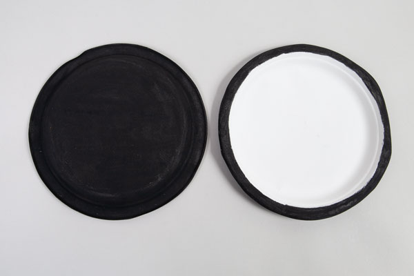 Bemalt zunächst zwei Pappteller mit Acrylfarbe: Die Außenseiten und den inneren Rand bemalt Ihr in Schwarz, die Innenseiten in Weiß. Lasst die Farbe anschließend gut trocknen.
