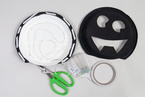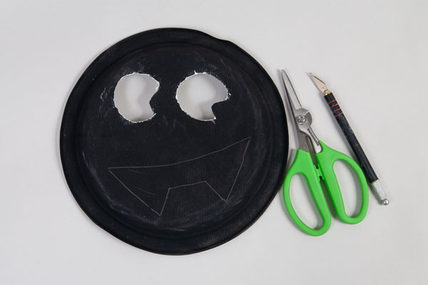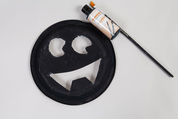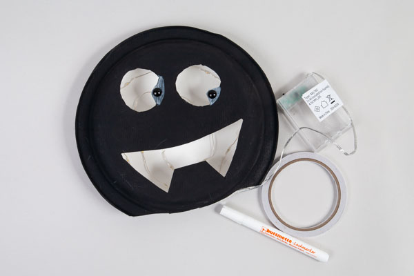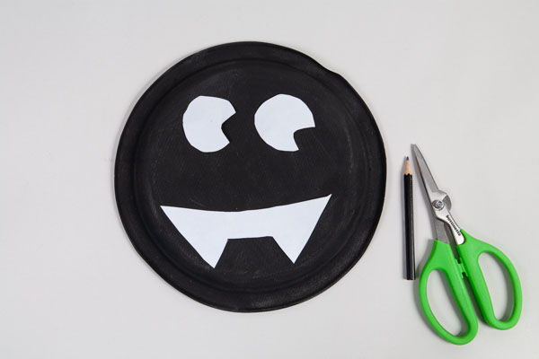 Druckt die Vorlagen, schneidet sie aus und übertragt Augen und Mund mit einem Bleistift auf einen schwarz bemalten Pappteller.