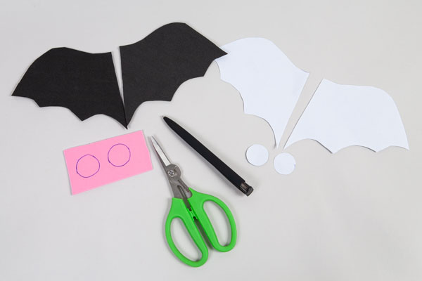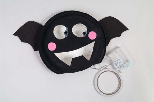 Klebt nun die ausgeschnittenen Flügel und Backen fest. Schon ist Eure Fledermaus fertig!