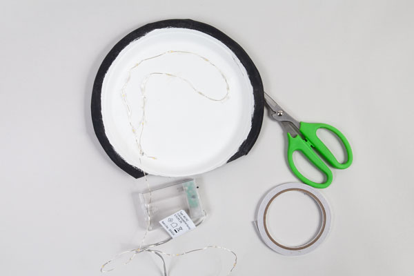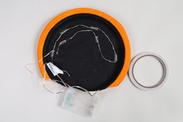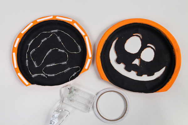Klebt nun eine Lichterkette mit doppelseitigem Klebeband auf die Rückseite der Figuren.
