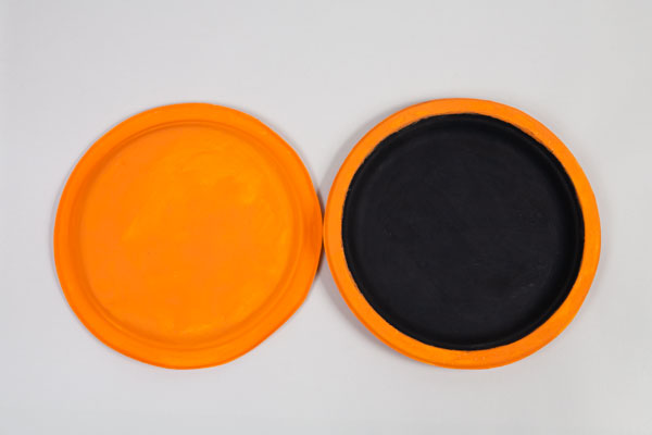 Bemalt für den Kürbis zwei Pappteller mit Acrylfarbe: Die Außenseiten und den inneren Rand in Orange, die Innenseiten in Schwarz. Lasst die Farbe anschließend gut trocknen.