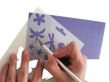 Die Schablone auf die Wachsplatte auflegen und mit dem Schneidemesser die Motive vorsichtig ausschneiden.