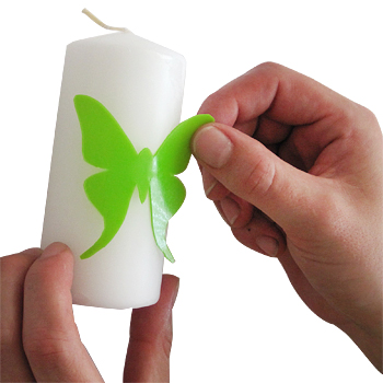 Die ausgeschnittenen Motive werden nun nur noch auf die Kerze gelegt und vorsichtig angedrückt.