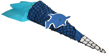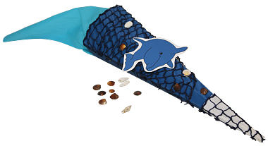 Fixiert nun den fertigen Delfin mit der Heißklebepistole mittig auf der Schultüte. Dann klebt Ihr noch ein paar kleine Muscheln, ebenfalls mit Heißkleber auf. Zum Schluss könnt Ihr das türkise Krepp-Papier mit der Schere noch etwas kürzen, falls es zu lang ist. Bindet das Krepp-Papier nur noch mit einer Schleife aus blauem und weißem Chiffonband zusammen und schon ist die traumhafte Delphin-Schultüte fertig!