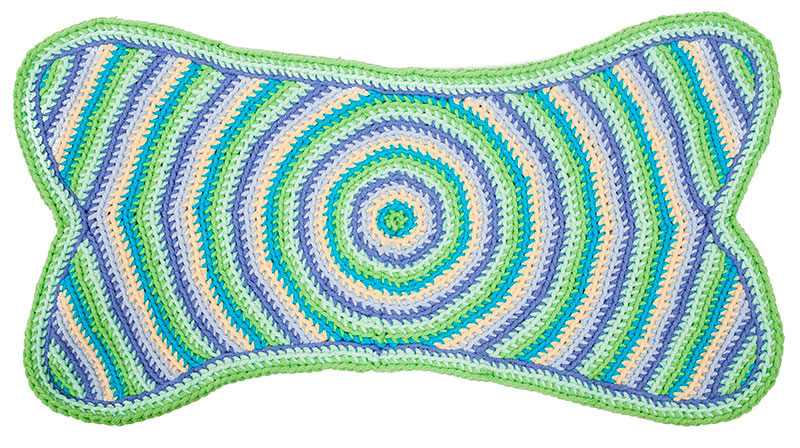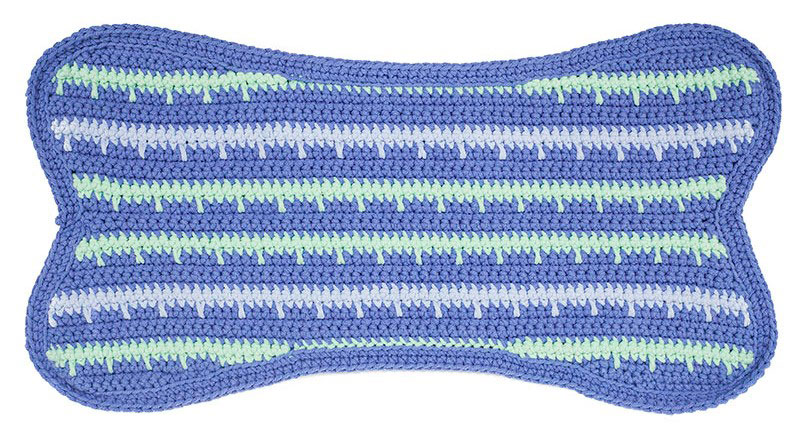 Weiter Teil 3 (aqua) mit Teil 1 (geringelt) zus. häkeln. Am Ende noch eine Öffnung zum Befüllen lassen. Dann füllt Ihr den Leseknochen mit Füllwatte bis zur gewünschten Festigkeit und häkelt ihn komplett zu.