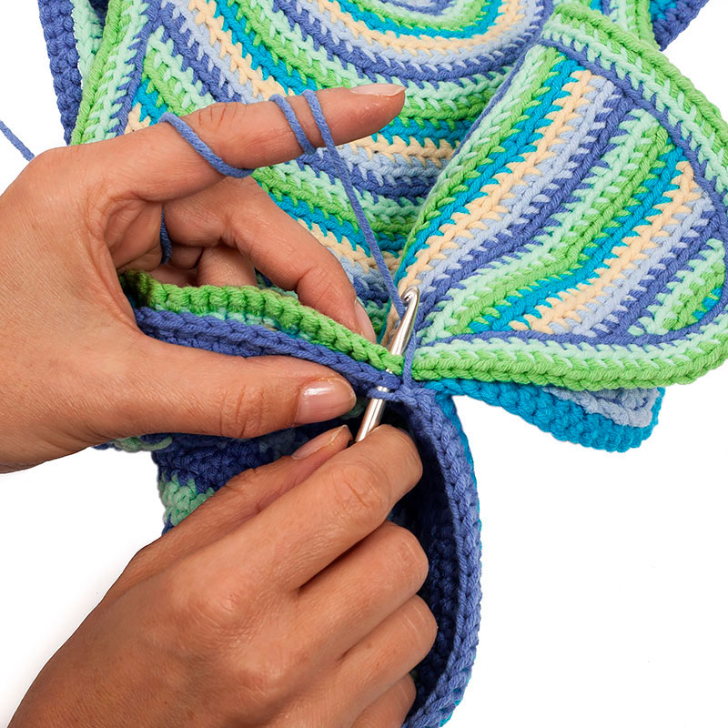 Nun alle 3 Teile mit fM in azur mit N 4 mm an einem Stück zus. häkeln. Dafür Teil 2 (azur gestreift) auf Teil 3 (aqua) legen (links auf links) und an der seitlichen Engstelle mit dem zus. häkeln beginnen.