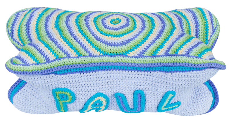 Fertigstellung: Fäden verknoten und vernähen. Buchstaben aus den Wollresten häkeln und auf Teil 3 aufnähen.