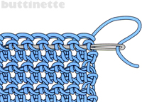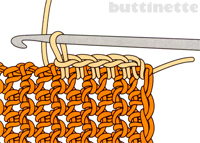 1. Den Faden an einer Kante anschlingen. Unterhalb der Wendeluftmasche in die folgende Reihe einstechen, den Faden zur Schlinge holen und durchziehen.