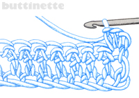 1. Abnehmen am rechten Arbeitsrand: Eine Masche mit einer Kettmasche übergehen. Diese Kettmasche wird in der Rückreihe nicht behäkelt. Bis zum linken Arbeitsrand häkeln.