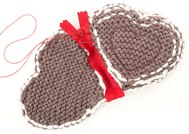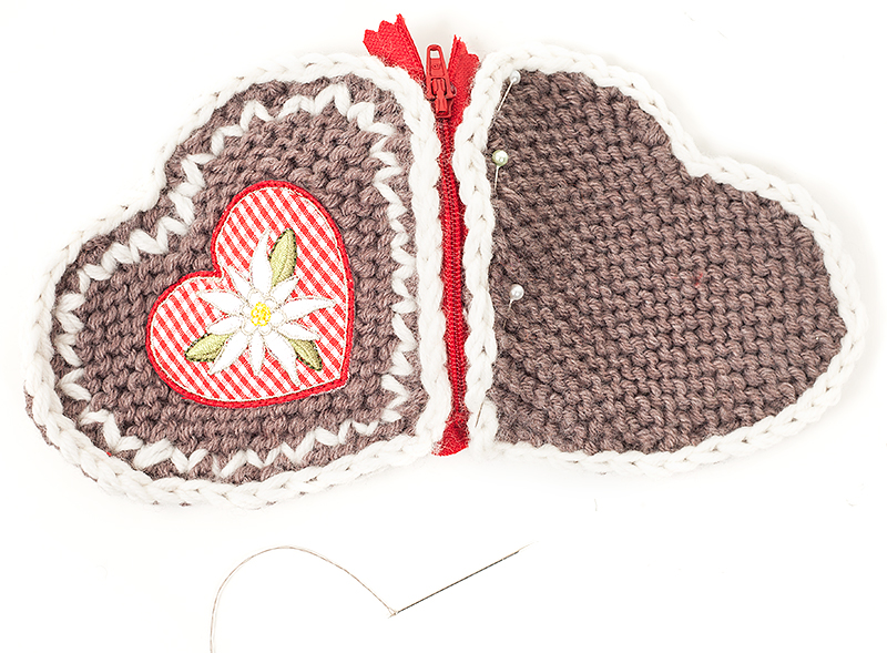 Reißverschluss schließen und das zweite Herz auf dieselbe Art befestigen.