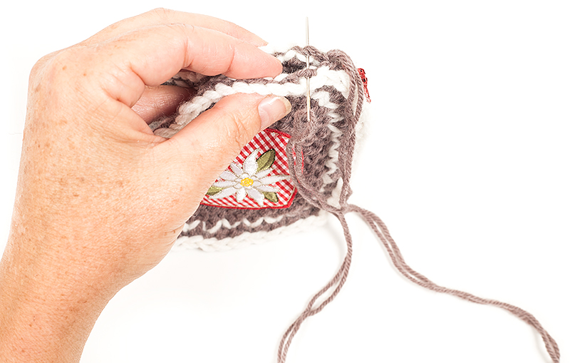Die beiden Seiten werden jetzt zusammengeklappt, so dass der Zipper außen liegt. Beide Hälften mit brauner Wolle im Schlingstich zusammennähen. Anfang und Ende des Reißverschlusses werden dabei jeweils nach innen gelegt. Zum Schluss noch die Fäden vernähen.