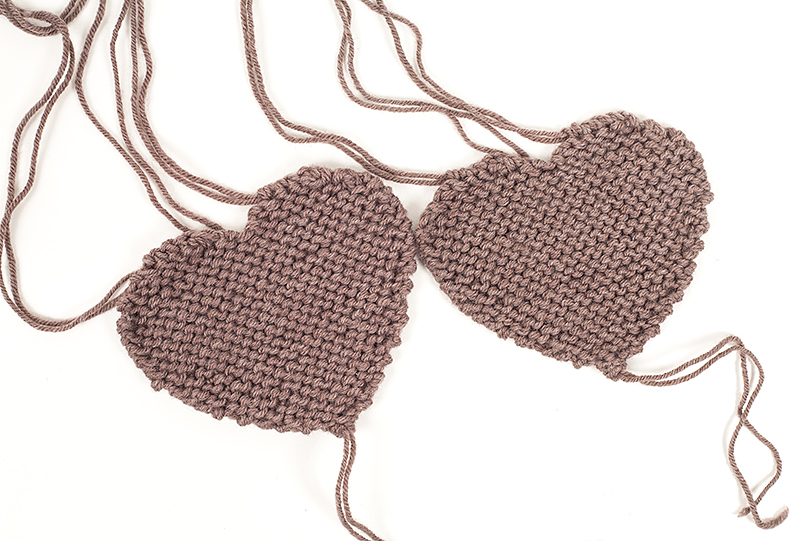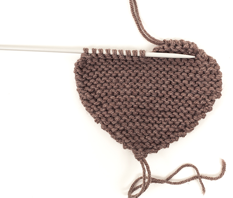 Dafür werden die beiden Fadenenden des Knäuels miteinander verarbeitet. Das Herz wird ohne Randmaschen kraus rechts gestrickt. Das bedeutet, Hin- und Rückreihen werden immer in rechten Maschen gestrickt.