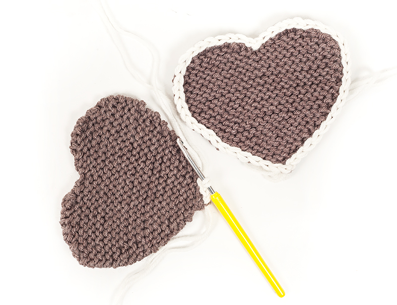 Beide Herzen werden mit einer Reihe Kettmaschen umhäkelt. Auch dafür wird die Wolle doppelt genommen.