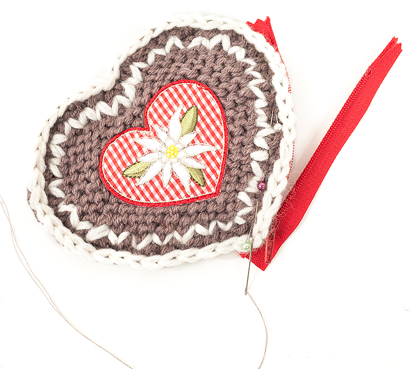 Die eine Hälfte des Reißverschlusses wird, wie gezeigt, mit Stecknadeln so auf die Rückseite des bestickten Herzens gesteckt, dass die Zähnchen bündig zur Häkelkante sind.