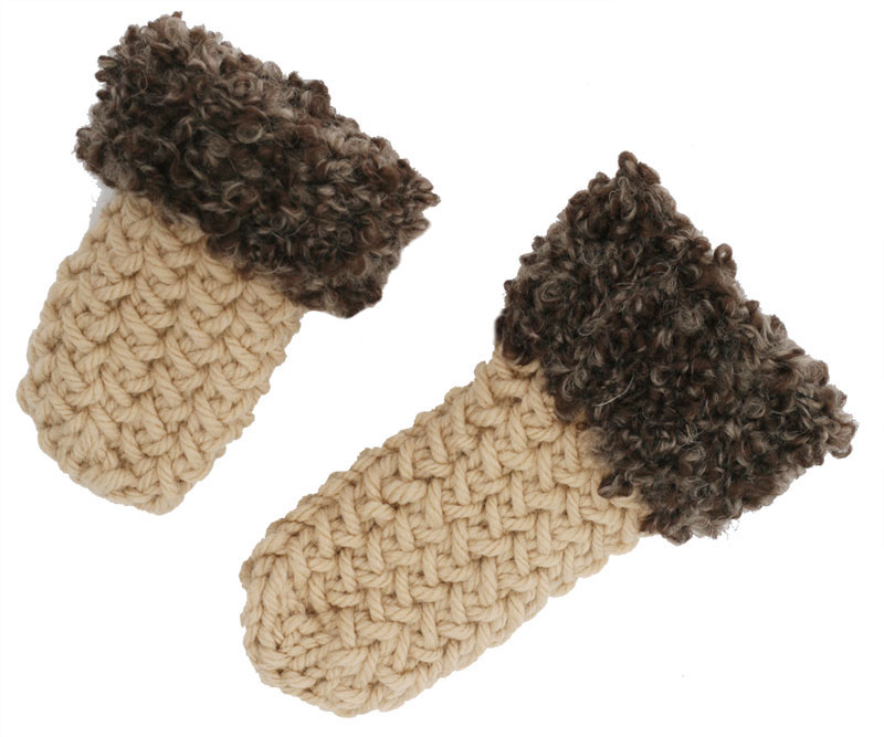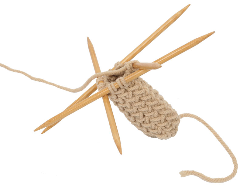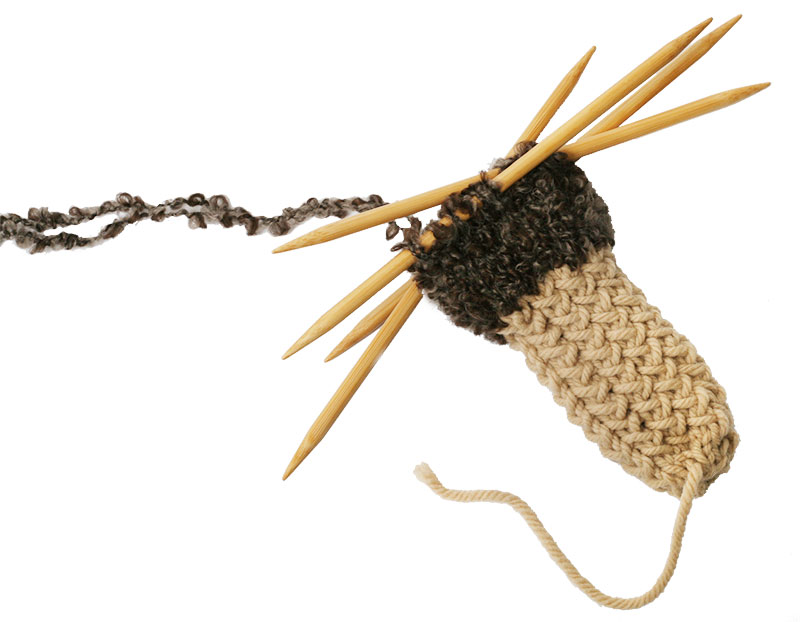 In der 18. Runde zur Puppenwolle in Fb. braun wechseln. Die Wolle wird dann doppelt verstrickt. Dazu verarbeitet Ihr den Faden des Knäuels von innen und außen gleichzeitig. Für die Krempe über 8 Runden re M stricken.
