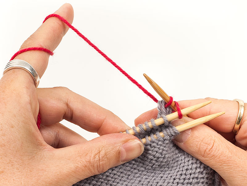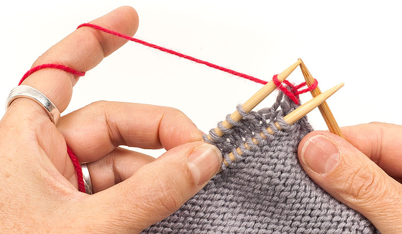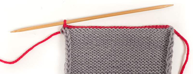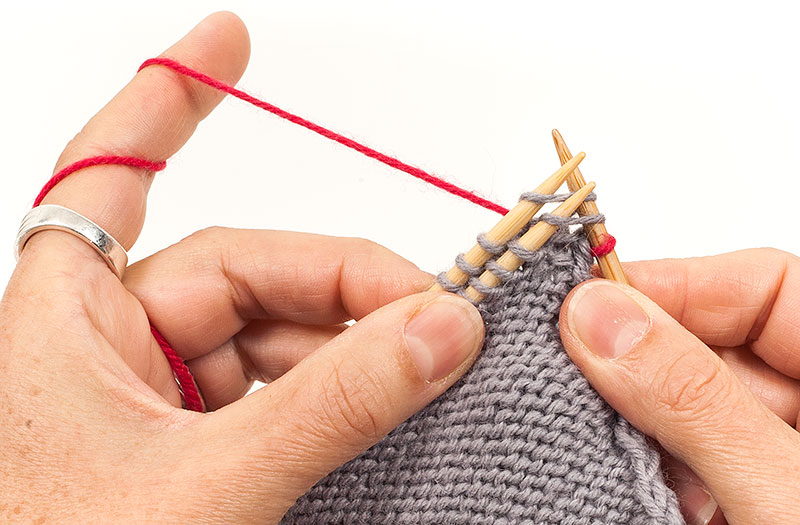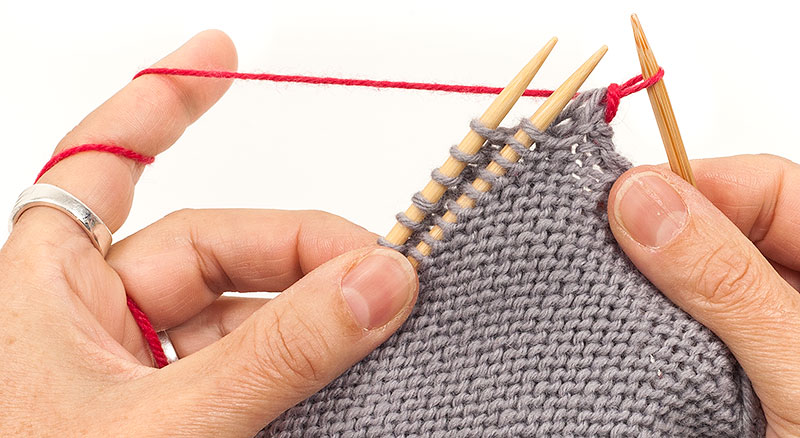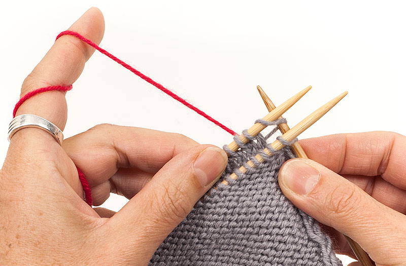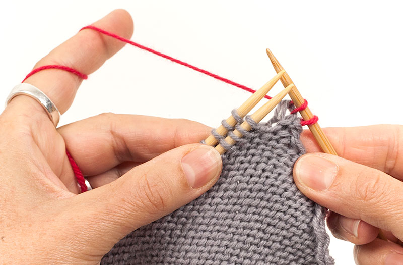 2. Wieder die ersten Maschen beider Nadeln rechts zusammenstricken.